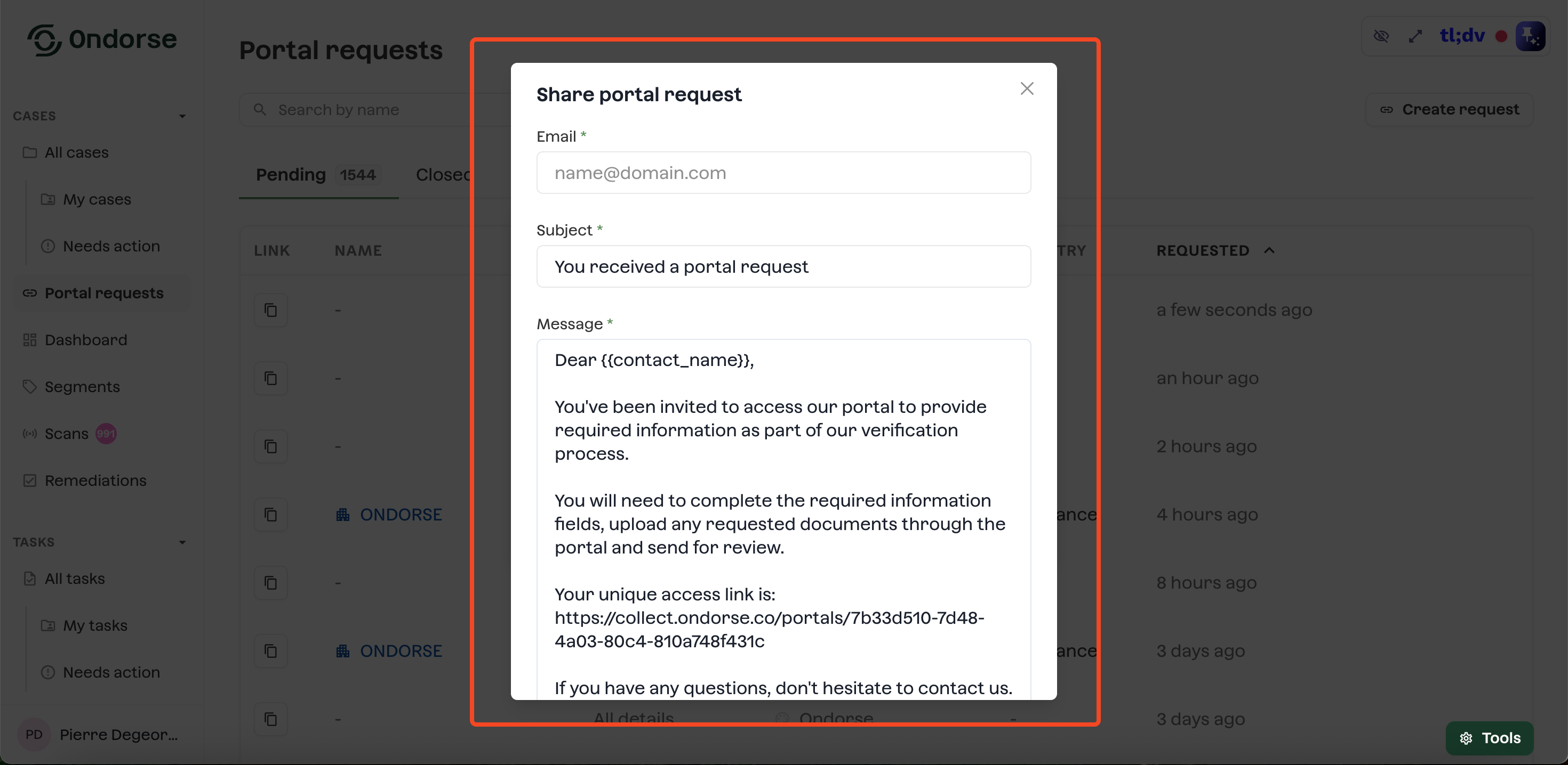 Send portal requests by email in Ondorse: send portal requests directly by email from Ondorse. Yes, we support custom email providers.