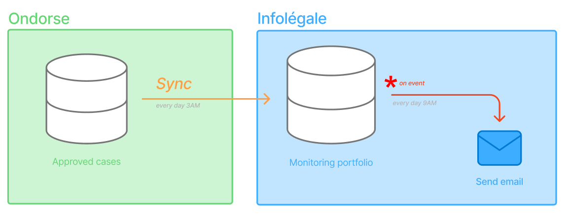 When this feature is turned on, approved cases are added to Infolégale’s monitoring portfolio. From there, Infolégale monitors the entities and notifies the user if anything noteworthy happens: legal events, dissolution, solvability events..