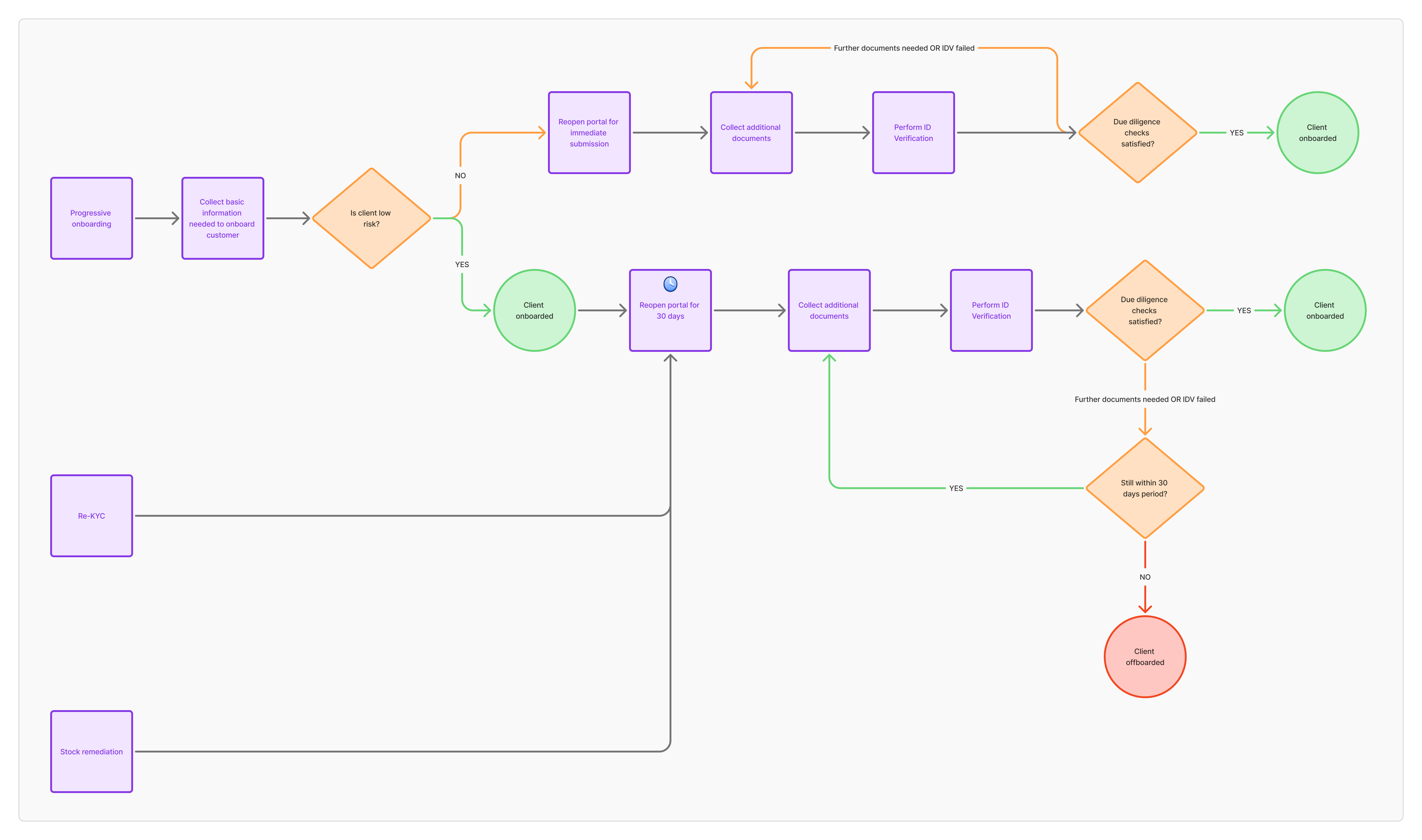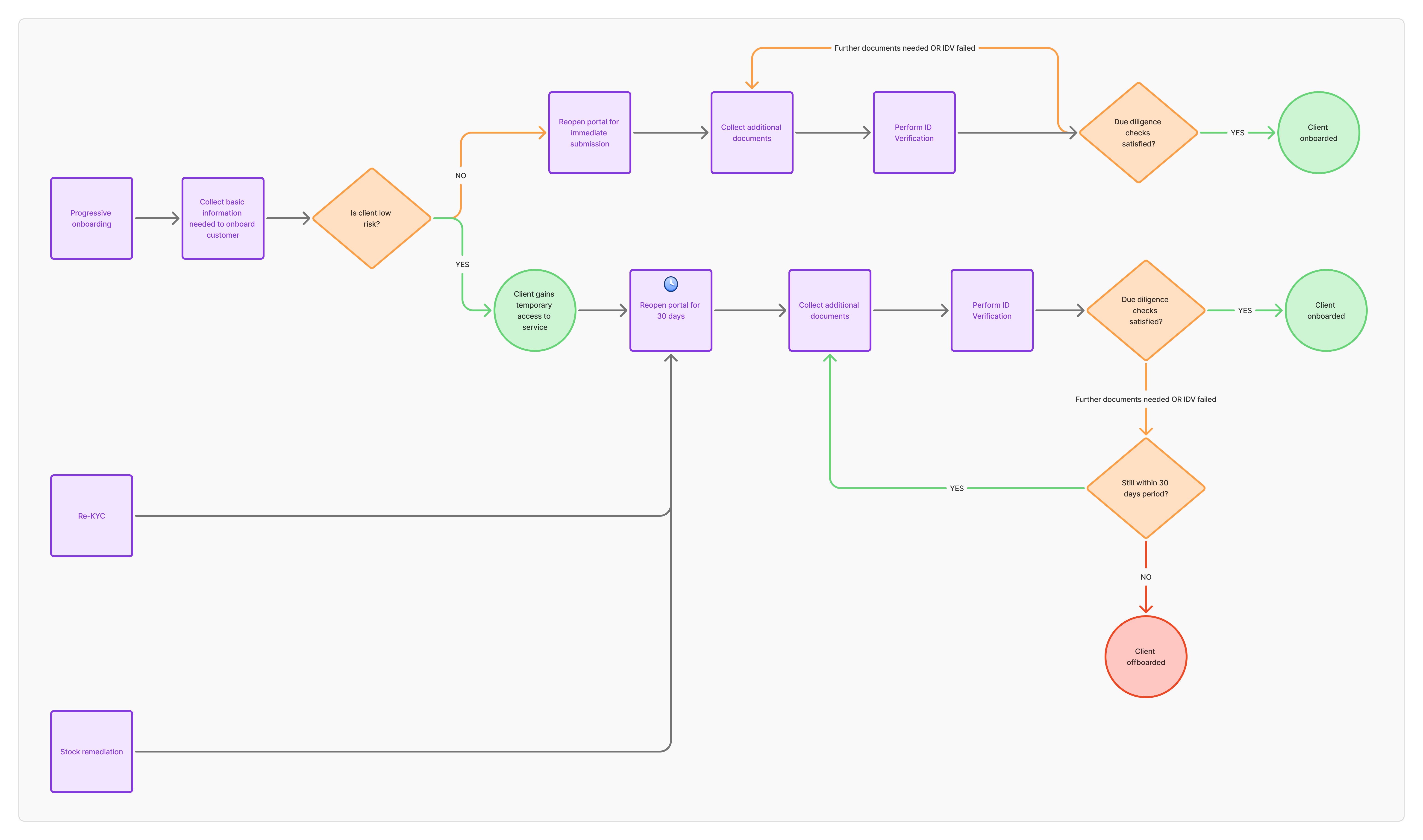 - onboard low-risk clients while giving them time to provide missing information or identity verifications