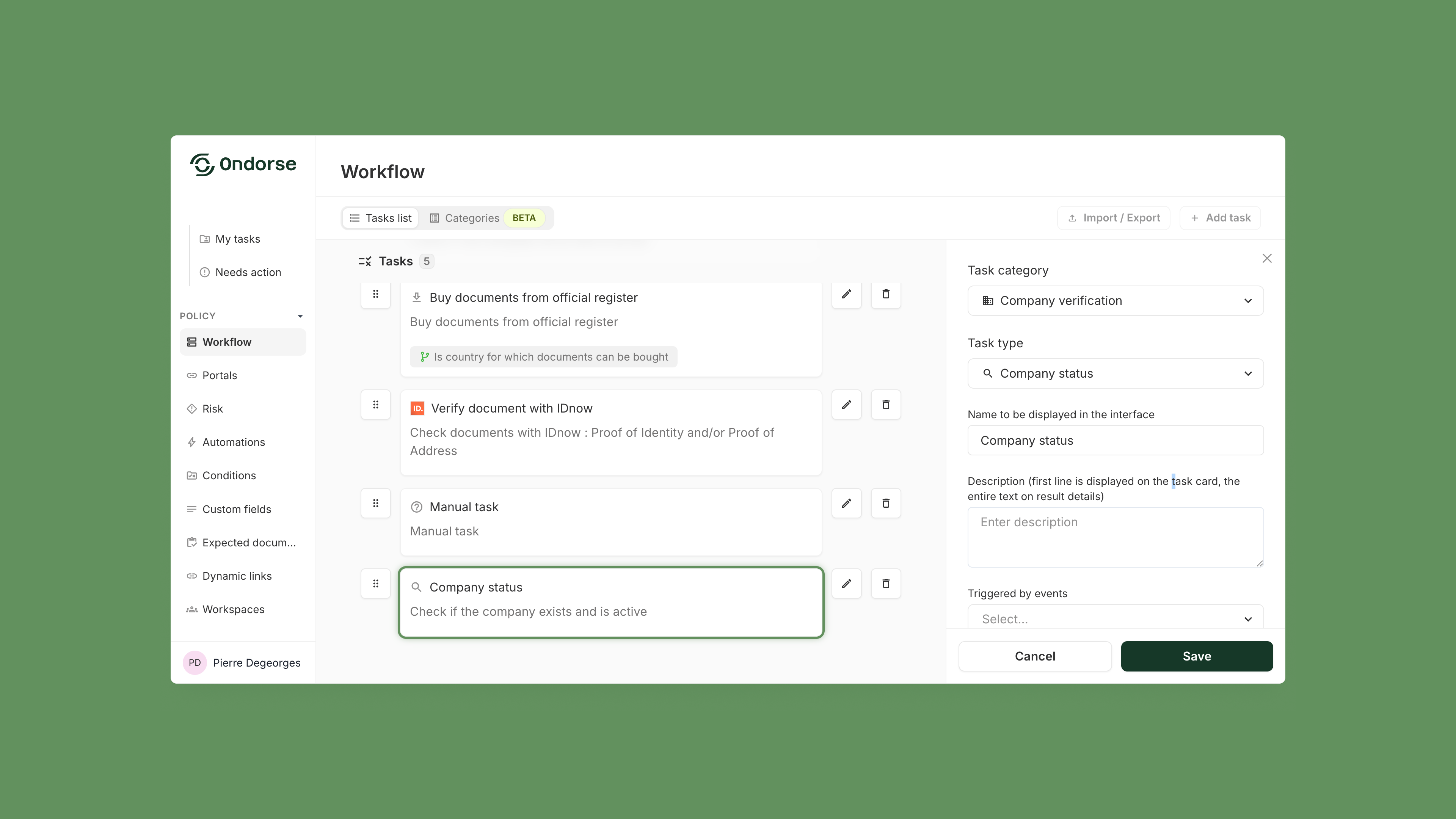Ondorse lets you build and run workflows as you like. It orchestrates all the bricks of your compliance stack.